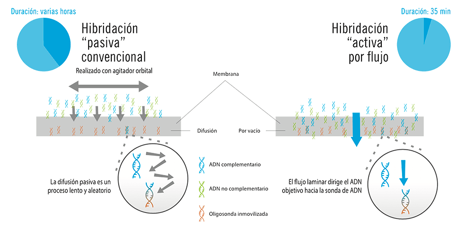 Acelera el proceso y aumenta la sensibilidad, reduciendo los volúmenes de reacción y el tiempo total de procesamiento, desde varias horas a pocos minutos.